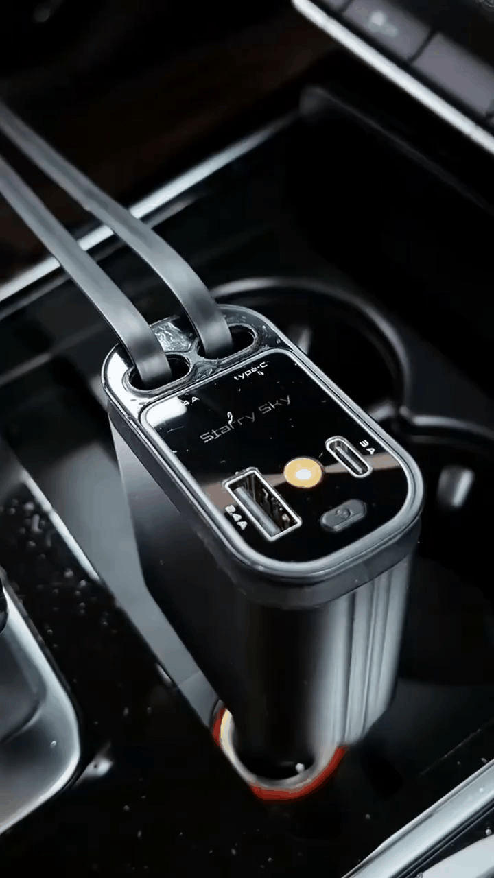 Incluye 2 cables extensibles hasta 80 cm con sistema de retracción automática que evita enredos y mantiene tu auto ordenado 🚘